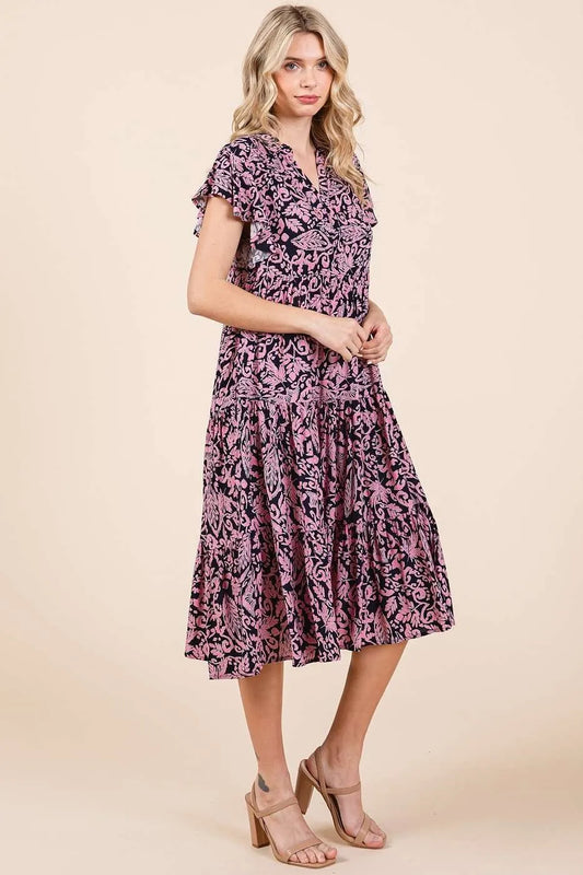 Printed V-Neck Flounce Sleeve Tiered Midi Dress
