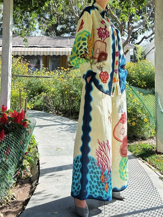 Printed Collared Neck Shirt and Wide Leg Pants Set