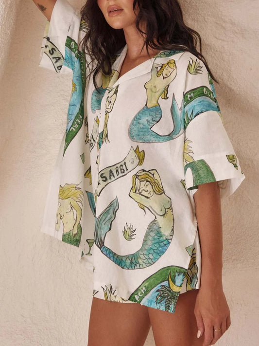 Shell Print Long Sleeve Shirt and Belt Shorts Set