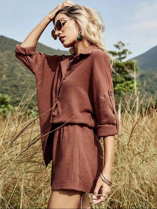 Button Collar Drop Shoulder Top and Shorts 2pcs Set