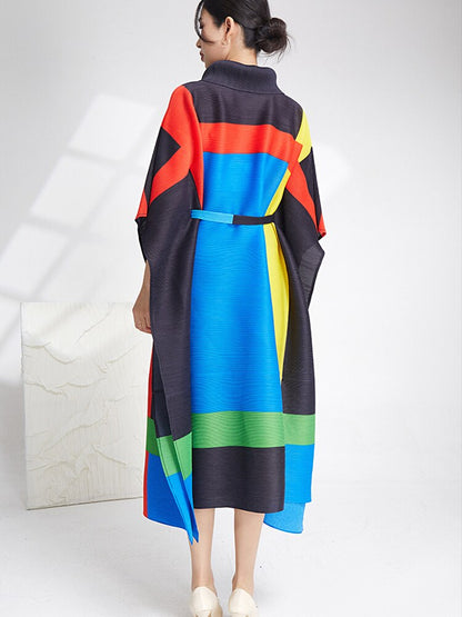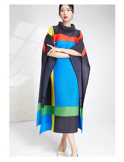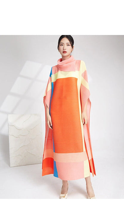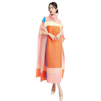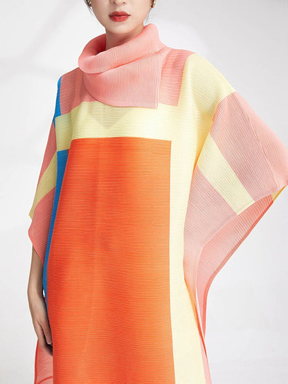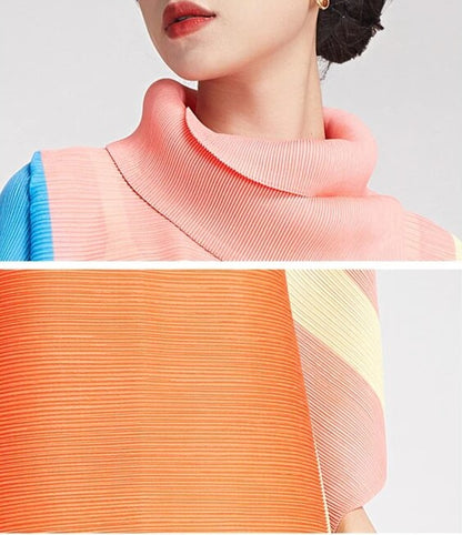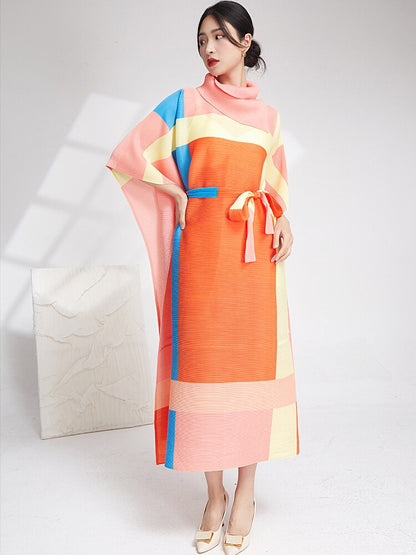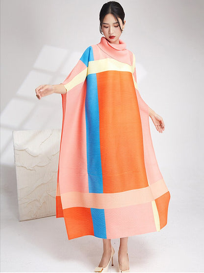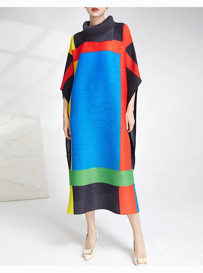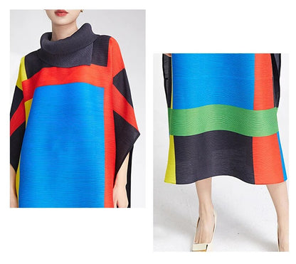 Miyake Pleated Contrast Turtleneck Midi Dress