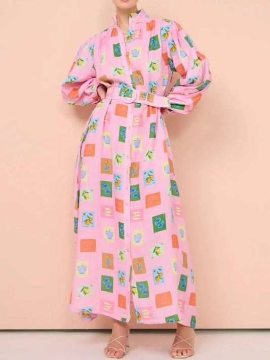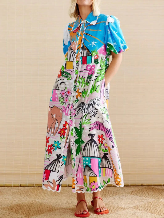 Printed Short Sleeve Maxi Shirt Dress with Belt