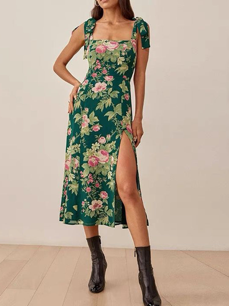 Tropical Leaf Print V-Neck Maxi Cami Dress