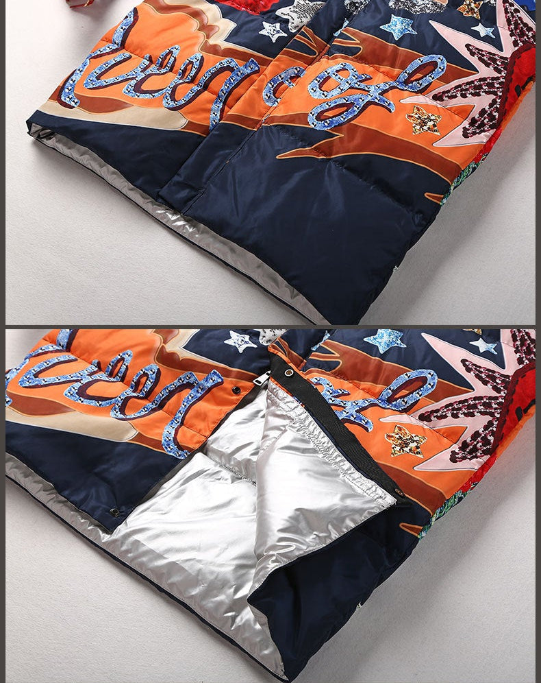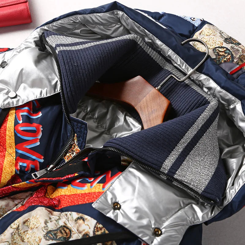 Printed Ribbed Collar Hooded Duck Down Overcoat