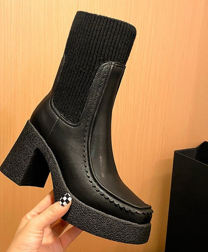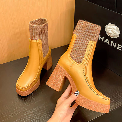 Genuine Leather Chunky High Heels Ankle-Length Boots