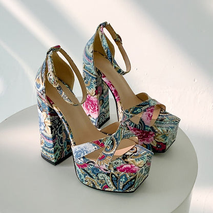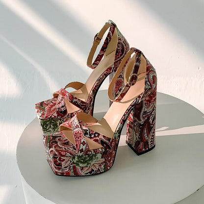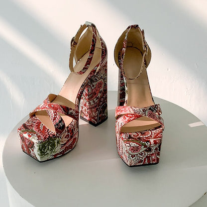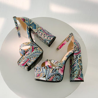 Graffiti Print Square Toe High Heeled Platform Sandals